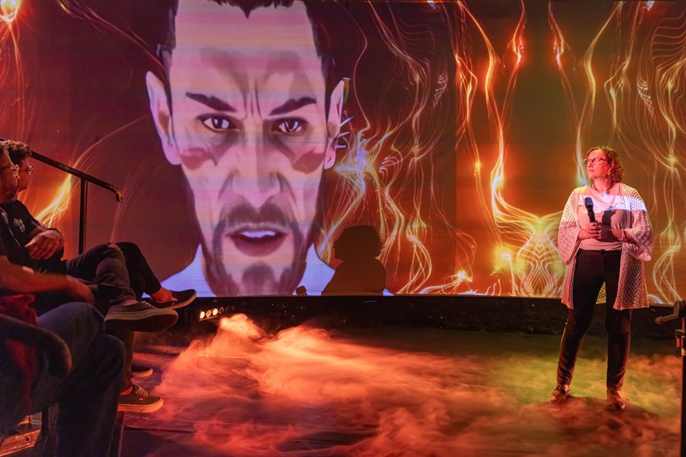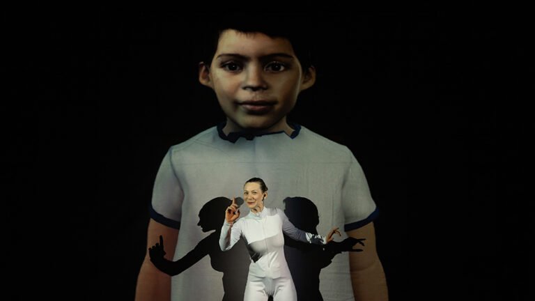 Nos bastidores da cena, a atriz Mariana Leme e o designer de IA generativa Thiago Capella manipulam ao vivo esse avatar em constante mutação, que assume feições diversas como robô, mulher, homem, criança e idosa, respondendo sensivelmente aos temas que emergem da participação do público. Tecnologias de captura de movimento com inteligência artificial transformam a imagem e a voz da atriz em uma máquina que busca compreender as escolhas humanas e seus impactos na sobrevivência coletiva.