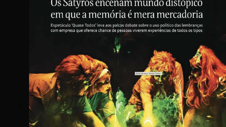 Esse sistema de compra e venda de memórias inspira a peça “Quase Todos”, em cartaz no Sesc 24 de Maio, na capital paulista. Escrita por Ivam Cabral e Rodolfo García Vázquez, fundadores dos Satyros, o espetáculo apresenta ao público a Calínia Corporation, empresa especializada em comercializar memórias. O empreendimento foi criado por Jacinto, personagem de Diego Rifer. “Memória não é só lembrança. É dinheiro, ativo, capital”, diz o empresário na encenação.
