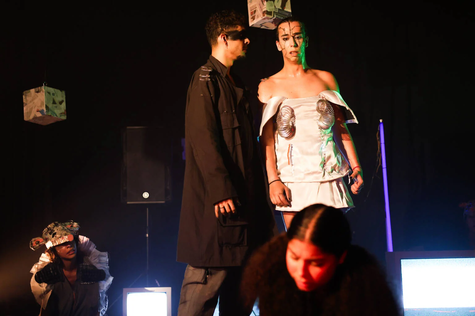 “Dentro” mergulha na distopia íntima. AndreIA, andróide lapidada por implantes e tecnologias, acessa seu “Cyber Cérebro” para rastrear a falha que a atravessa. No ruído do tetaphone que pifa, irrompe a pergunta essencial: onde termina a máquina e começa a ferida humana? A cena funciona como um escaneamento sensível: memórias artificiais, consumos produzidos, próteses emocionais e a solidão como cicatriz original. AndreIA enfrenta o vazio que o mercado tenta preencher com upgrades, até perceber que a identidade, quando vendida, se dilacera. O núcleo, fértil em dramaturgia, direção, técnica e invenção visual, constrói essa travessia sem retorno com rigor e potência. Trabalho consistente, em que as linhas de estudo se encontraram com harmonia, fazendo emergir temas contemporâneos em sintonia com o projeto do grupo.