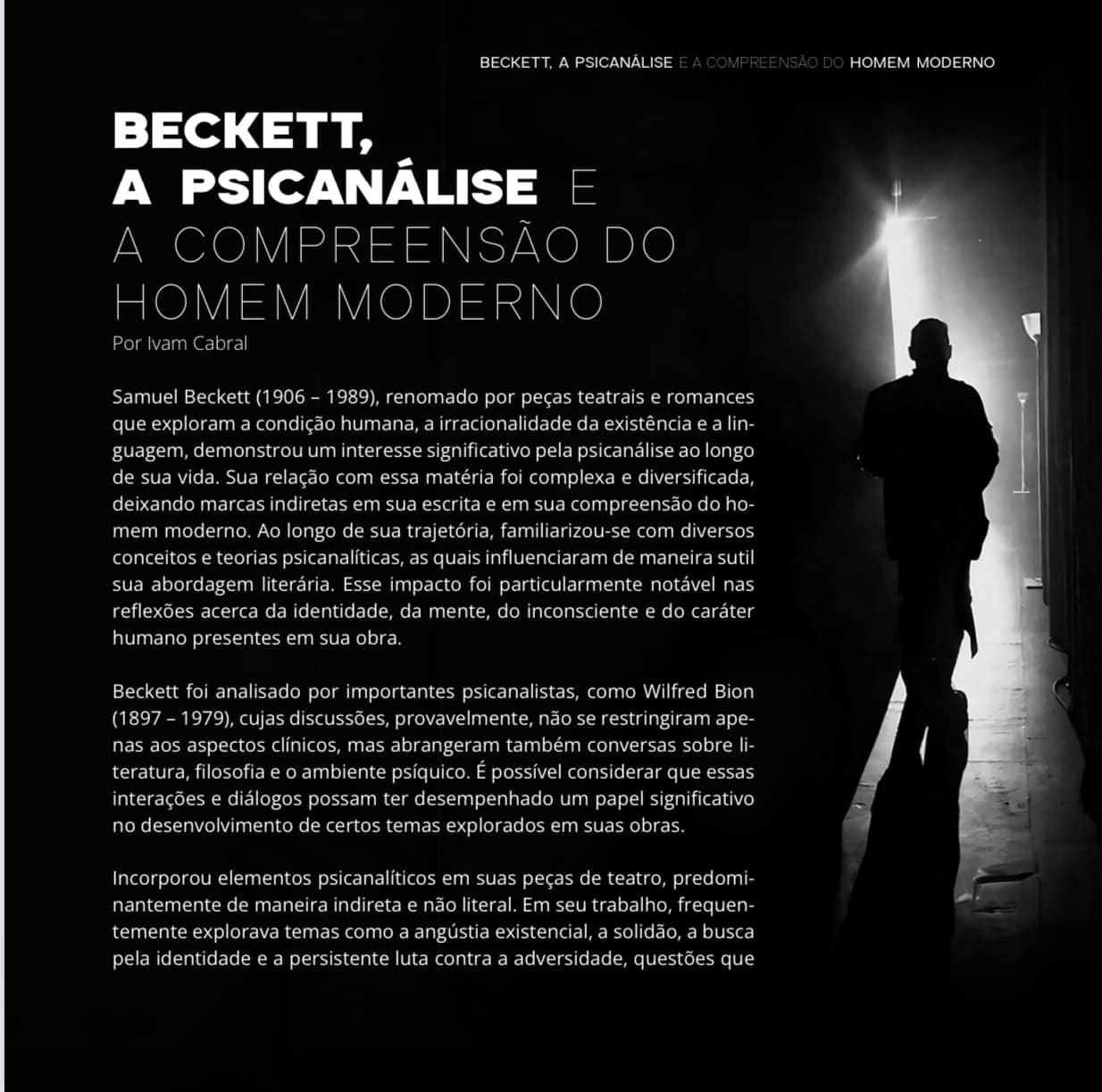 Nesse artigo, examino a relação de Samuel Beckett com a psicanálise, em especial sua análise com Wilfred Bion, e como conceitos freudianos e bionianos atravessam sua obra: vazio, desamparo, memória e a falha da linguagem. Em peças como “Esperando Godot” e “Fim de Partida”, emergem personagens entre solidão, repetição e busca de sentido. A angústia e a fragmentação do homem moderno. Beckett e Bion partilham a economia da linguagem e o interesse pelo vazio como origem do pensamento. Arte e psicanálise, ali, traduzem o indizível.