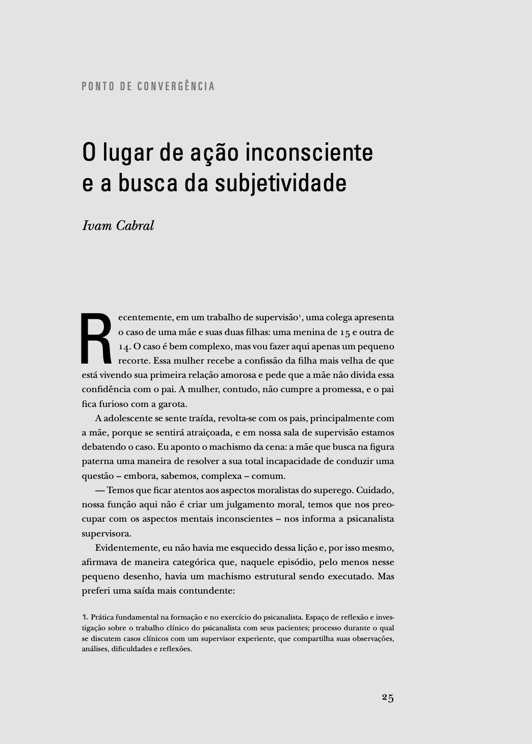 Também escrevi, para a revista A[L]BERTO, “O lugar de ação inconsciente e a busca da subjetividade”, onde parto da confidência de uma adolescente traída pelos pais para criticar o moralismo superegóico e sustentar que a clínica considere o “lugar de ação” do sujeito: gênero, raça, classe e território (Higienópolis ≠ Parelheiros) moldam o inconsciente. Um flagrante de violência policial contra um jovem negro reforça como a psique é atravessada pelo racismo estrutural e pela branquitude, dimensão que a psicanálise muitas vezes evita encarar. Em diálogo com Freud, Lacan, Fanon, Preciado e, especialmente, Isildinha Baptista Nogueira, defendo uma escuta ética, potente e transformadora.
