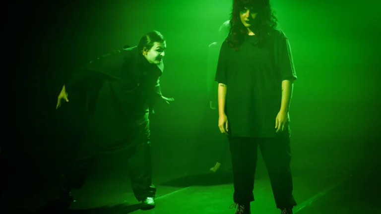 A luz, mesmo atravessada por acidentes e apagões imprevistos, parece ter encontrado uma verdade própria. Assisti à estreia e soube, depois, que a equipe precisou lidar com falhas inesperadas. Blackouts que surgiam sem aviso. Ainda assim, nada soava fora de lugar. Ao contrário. Havia uma coerência inesperada nisso tudo. Como se a falha não interrompesse o espetáculo, mas o aprofundasse. Uma luz que não revela. Contamina. Um verde espectral que não ambienta, mas infiltra.
